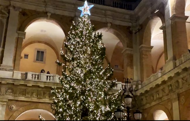 Acceso a Loreto, oggi alle 18.45, il grande albero di Natale donato da Andalo, città gemellata, davanti a un folto pubblico di spettatori tutti protetti dalla mascherine anti-Covid.