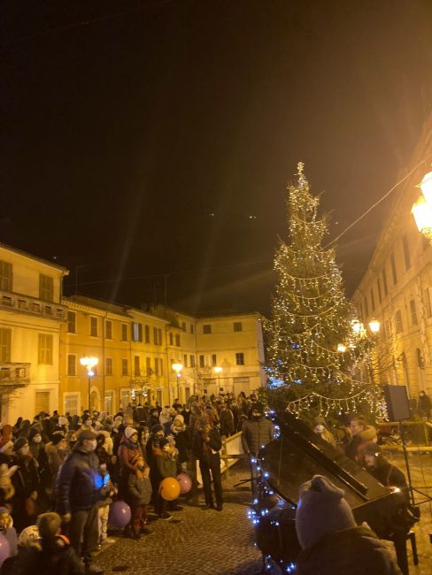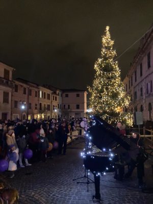 La S-Banda ha aperto le danze suonando e intrattenendo i partecipanti con canzoni natalizie, seguita poi dal Coro Città di Camerano che per la prima volta si esibiva all’aperto in Piazza e che è stato più volte inneggiato al bis. «Chiusura della serata riservata a Giulio Santini e a Giovanna Sofia Principi, – chiude il comunicato – che hanno accompagnato l’accensione dell’albero avvenuta con le luci della piazza completamente spente. Immagine suggestiva rovinata però dal maltempo, fortunatamente giunto al termine di un pomeriggio di festa».