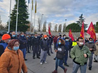 I lavoratori Caterpillar stamattina all’assemblea davanti ai cancelli Cnh, un’altra azienda del settore meccanico di Jesi