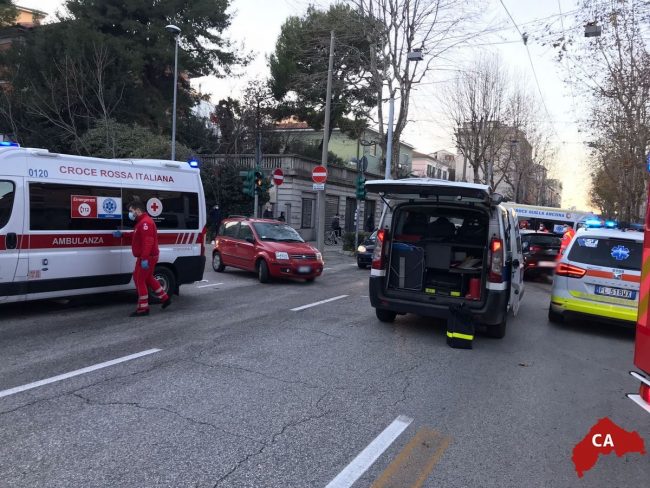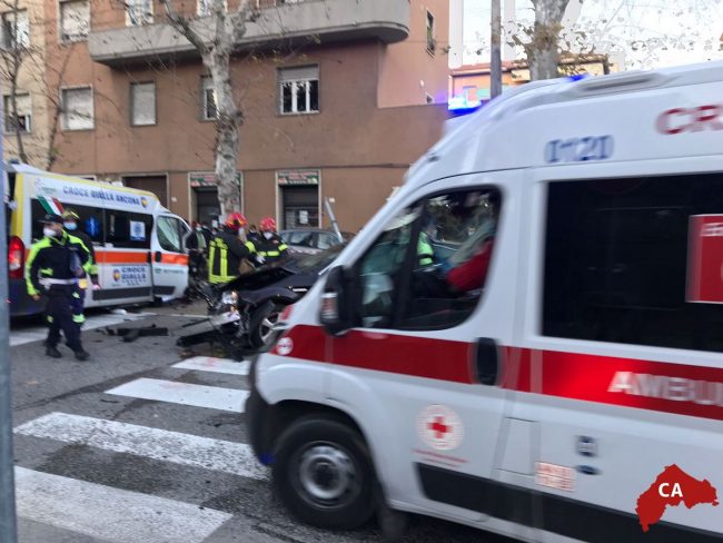ANCONA - L'incidente è avvenuto in via Giordano Bruno. Sul posto, oltre ai mezzi di soccorso, le squadre dei Vigili del fuoco e la Polizia Locale