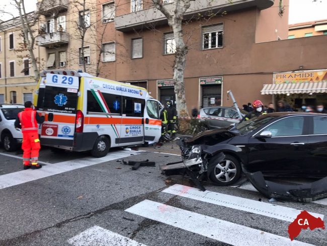 Nello scontro, uno dei due mezzi ha abbattuto un semaforo dopo essere salito sopra l’aiuola che divide la strada dal marciapiede. Avvisata la centrale operativa di Ancona Soccorso, sul posto sono intervenuti un mezzo della Croce Rossa con una squadra dei Vigili del Fuoco e la Polizia Locale.