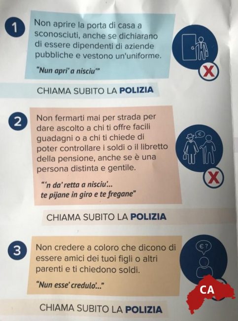 La brochure, molto snella e accattivante per essere scritta anche con frasi in anconetano e stampata in oltre 10mila copie, mette in evidenza su tutte, 2 particolari truffe: «Non aprire agli sconosciuti e interrompere la conversazione telefonica quando si viene chiamati da persone che non si conoscono. Solo rispettando queste indicazioni – ha commentato Capocasa -, andremmo a ridurre in maniera significativamente drastica le truffe che colpiscono in maniera così odiosa la categoria fragile degli anziani».