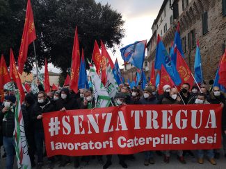 E’ partito intorno alle 16 di oggi pomeriggio, da Porta Valle a Jesi, il corteo degli operai della Caterpillar, promosso dal’Amministrazione comunale e dalle organizzazioni sindacali Fim Cisl, Fiom Cgil e Uilm Uil dopo l’annuncio della multinazionale statunitense sulla chiusura dello stabilimento di via Roncaglia. A rischio il lavoro di circa 270 dipendenti. In testa era aperto da uno striscione con la scritta ‘Senza Tregua’ e animato da cori e slogan, fumogeni e fischietti. «Chi non salta americano è» hanno urlato le maestranze e «non molleremo mai». Il serpentone con oltre mille persone, che ha attraversato le vie centrali della città, è arrivato verso le 17 piazza della Repubblica e poi in piazza Federico II dove sul placo si sono tenuti gli interventi, con a conclusione, alle 18.30 il concerto dei Sambene.