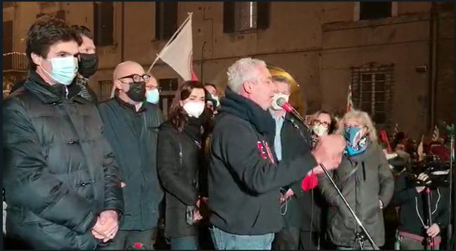 Sul palco i lavoratori, nei vari interventi, hanno ripercorso i momenti più convulsi della giornata dello scorso 10 dicembre, quando l’ad francese della Caterpillar ha annunciato loro l’avvio della procedura di mobilità. Hanno ringraziato i presenti, che la piazza non è riuscita a contenere tutti, molto sono rimasti lungo il corso. «Abbiamo visto che ci sono anziani e persino bambini a questa manifestazione. La verità è che oggi non dovevamo essere qui. Oggi dovevamo essere un giorno felice invece siamo qua. Il dono più grande che potete fare ai lavoratori della caterpillar è di non lasciarli soli. I giorni più difficili sono quelli che arriveranno» ha detto il segretario nazionale Fiom-Cgil Michele De Palma. «Il conto alla rovescia della procedura dei licenziamenti lo dobbiamo fermare – ha proseguito – Draghi chiami al tavolo del Mise la multinazione. Quando i cancelli si chiudono è difficile riaprirli, lo so per esperienza. Faremo perciò tutto quello che nelle nostre disponibilità di sindacati. Il governo però convochi immediatamente il tavolo al Ministero dello Sviluppo economico».