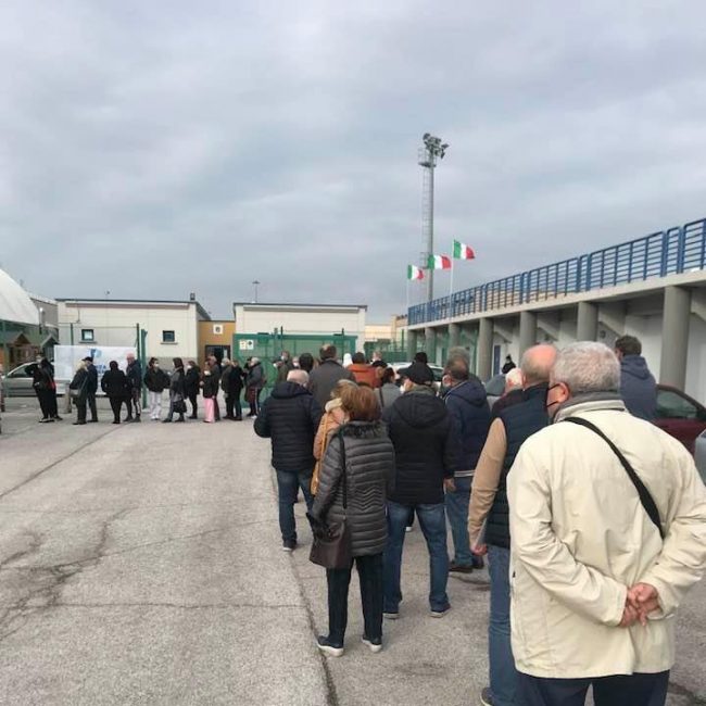 Utenti in coda all’esterno all’hub vaccinale al centro Paolinelli di Ancona