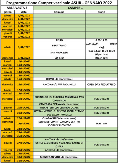Sabato 8 gennaio il Comune di Filottrano ha organizzato un open day dalle ore 9 alle ore 13 nella palestra delle medie dell’Ic Beltrami, aperto a tutti a partire dai 12 anni e senza prenotazione. Il 9 gennaio ci sarà un open day aperto a tutti in località Montorso di Loreto, presso il parcheggio del centro “Giovanni Paolo II”,«mentre rimane attivo il centro vaccinale dell’ospedale previa prenotazione con il numero verde. – ricorda anche Dino Latini – Si sta approntando da parte di Regione con Asur e Inrca, l’organizzazione di open day vaccinali da attivare nei fine settimana del mese di gennaio. Nella città di Osimo, il Poliambulatorio, resta la sede di riferimento, ma non si esclude, sempre nel rispetto delle competenze della proprietà dello stabile e delle attività sportive in corso, un hub vaccinale al PalaBaldinelli , in cui si possano prevedere più linee vaccinali in grado di soddisfare la forte domanda degli assistiti. Il 6 gennaio, si ricorda, che al PalaBaldinelli ci sarà la giornata per i tamponi per gli studenti delle elementari e medie . Seguiranno altre giornate aperte per la vaccinazione, le cui date saranno più precisamente indicate. Nel frattempo si stanno aiutando tutte le associazioni di volontariato o altre che stanno approntando hub vaccinali». Di seguito le tappe del camper vax dell’Area Vasta 2 già programmate per il mese di gennaio alla data odierna.