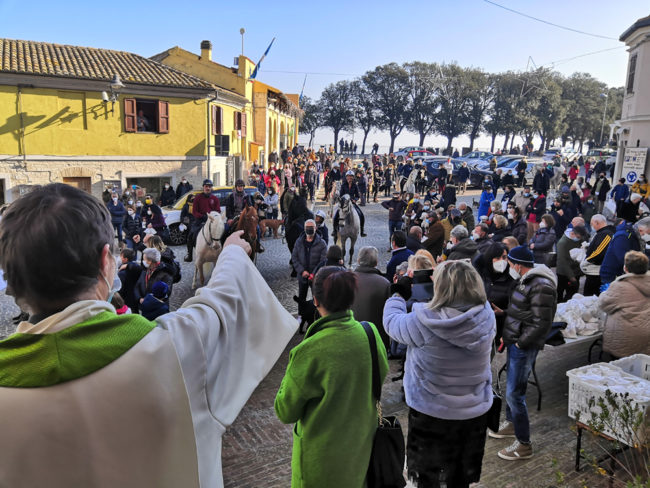 Stamattina il sagrato della chiesa di San Nicola a Sirolo si è trasformato in una allegra ‘fattoria’. Alle 8.45 don Michele Marchetti ha benedetto il pane, preparato e distribuito dalla Confraternita del Santissimo Sacramento.