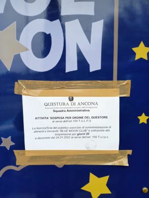 Oltre alla chiusura attuale, l’Ufficio Pubblico Spettacolo del Comune di Ancona, a seguito alla segnalazione della polizia, ha emesso nei confronti del titolare del locale l’Ordinanza di cessazione immediata di ogni attività di pubblico spettacolo.