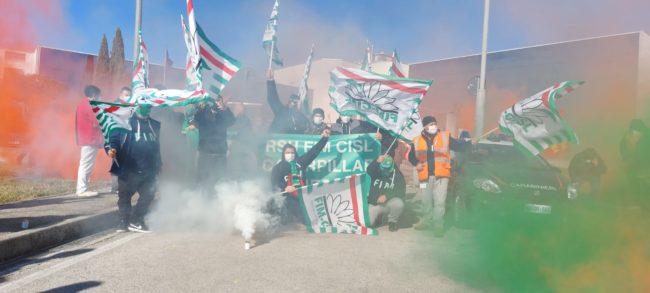 La protesta dei lavoratori della Caterpillar di Jesi questa mattina si è spostata davanti alla sede Confidustria, alla Baraccola di Ancona, proseguendo fino alla rotatoria davanti alla multisala Giometti, senza fermare il traffico ma solo rallentandolo. Cori, striscioni, bandiere e fumogeni hanno animato il sit-in dei lavoratori e dei rappresentanti sindacali di Fim Cisl, Fiom Cgil e Uilm Uil oltre che della Rsu, mobilitati dalle 10 di questa mattina per richiamare l’attenzione di automobilisti e istituzioni sulla procedura di mobilità annunciata dalla multinazionale statunitense ai circa 270 operai dello stabilimento di via Roncaglia.
