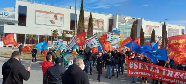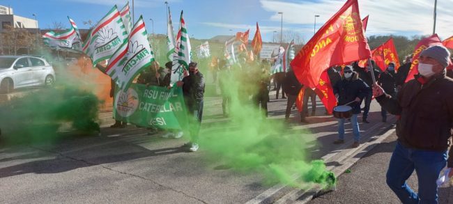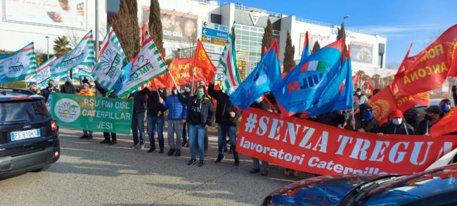 Il sit in degli operai della Caterpillar di Jesi questa mattina alla Baraccola: prima i lavoratori hanno manifestato davanti alla sede di Confidustria di Ancona e poi in corteo si sono spostati fino alla rotatoria davanti alla multisala Giometti