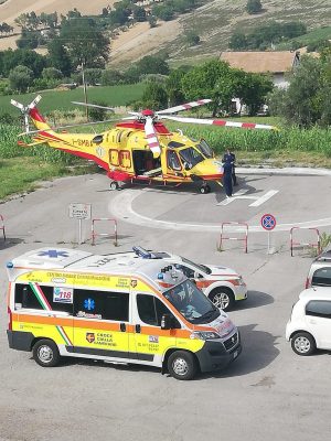 La Croce Gialla di Camerano, automedica e Icaro durante un soccorso (Archivio)