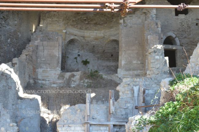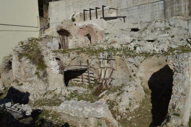 IL PROGETTO – Il primo stralcio comprenderà tutta l’area a monte, con i baricentrico Palazzo degli Anziani, la risistemazione e parziale variazione del percorso dell’adiacente via Rupi Comunali e, soprattutto, la fetta del rione del XIII secolo, attualmente occultato sul fianco destro del citato palazzo sede del Consiglio comunale. Attraverso un ardito sistema di scale e camminamenti sospesi, in parte nuovi, cittadini e turisti potranno ammirare il cosiddetto “sacello”, ovvero una doppia cappella religiosa posta su due piani di cui si conserva in particolare l’abside, la cospicua porzione di una torre parte dell’antica cinta muraria elevata sul mare e una casetta. Come hanno spiegato la Ciuccarelli e l’architetto Claudio Centanni, dirigente dell’area Urbanistica comunale, «quest’area sarà coperta da una struttura d’acciaio sottile per addolcire l’impatto visivo, così come saranno sostituite le attuali fatiscenti coperture in metallo degli ingressi». L’area sarà strettamente collegata a via Rupi Comunali e al sito degli arconi in pietra bianca, con i suoi affascinanti ambienti (da decenni in degrado e quindi da risanare) contenenti le palle di cannone usate nel Medioevo come proiettili. Così come sarà in link stilisticamente omogeneo con la sottostante piazza Dante Alighieri e il podio di Palazzo degli Anziani. La piazza sarà ripavimentata in modo da segnalare il perimetro della Chiesa di Santa Maria della Misericordia (1349) andata distrutta dai bombardamenti aerei della seconda guerra mondiale, di cui resterà visibile, in modo più chiaro, parte dell’abside incassato sotto il podio di ingresso di Palazzo degli Anziani. Anche questo podio basamentale verrà modificato, con la creazione di due livelli, uno dei quali, a guisa di terrazza, dotato di una panca panoramica, e con un nuovo accesso da piazza Dante Alighieri.