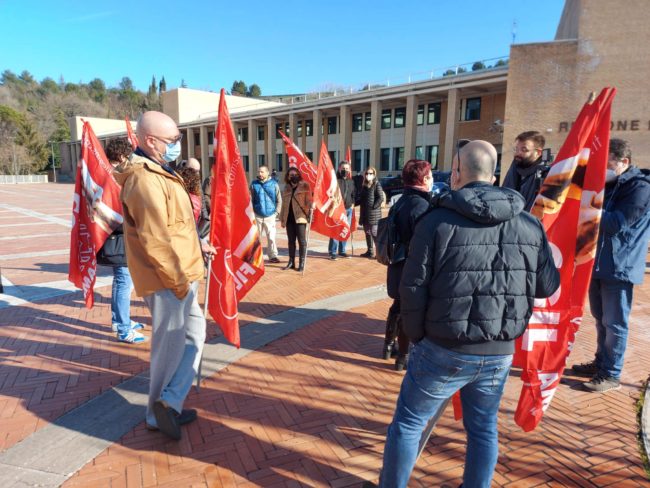 I lavoratori Liomatic durante il presidio della scorsa settimana davanti alla sede della Regione Marche (foto Giusy Marinelli)