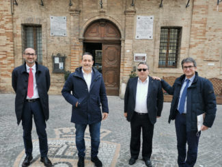 da sin. l’assessore Foria, il sindaco Ascani, il consigliere regionale Bilò e l’assessore regionale Baldelli dacanti al Comune di Castelfidardo