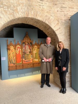 E ha concluso Francesca Carli, assessore alla cultura del Comune di Loreto: «Quando è stato proposto alla città di Loreto di accogliere la prima tappa di questa magnifica esposizione, come Amministrazione e come Assessorato alla Cultura abbiamo abbracciato con entusiasmo l’idea. In questo momento storico in cui ci stiamo lasciando alle spalle gli anni difficili della pandemia, abbiamo deciso di guardare avanti scommettendo, ancora una volta, nella bellezza e nella cultura. Abbiamo creduto in questo progetto che crea una sinergia forte tra tre importanti città, una vera e propria ‘rete’ culturale’ grazie alla quale l’esperienza di questo evento si moltiplica, letteralmente, nello spazio e nel tempo. È così che si condivide la cultura, è così che la si può rendere un veicolo reale di promozione dei luoghi e di crescita. Altro aspetto importante è il legame privilegiato tra la città di Loreto e il progetto scientifico di questa mostra: il pellegrinaggio. Le 22 opere esposte ci portano in un ‘cammino’ – è proprio il caso di dirlo – che va dal Medioevo al Rinascimento, passando da Crivelli a Caravaggio e molti altri. Un cammino che racconta, attraverso la devozione a San Michele Arcangelo, la figura del pellegrino. È un tema che ci appartiene profondamente. Come è noto, Loreto è una delle mete di pellegrinaggio più antiche e più conosciute al mondo. Dopo l’anno Mille furono proprio i pellegrinaggi il motore della ritrovata mobilità delle persone. Vogliamo pensare che, anche nell’attualità dell’oggi, dove c’è tanta necessità di ‘rimettersi in moto’, il pellegrinaggio e i pellegrini rappresentino la chiave di volta di una nuova voglia di partire e di un nuovo tipo di turismo, nel quale spiritualità e cultura si fondono armonicamente. Proprio come, da secoli, accade nella nostra Loreto».