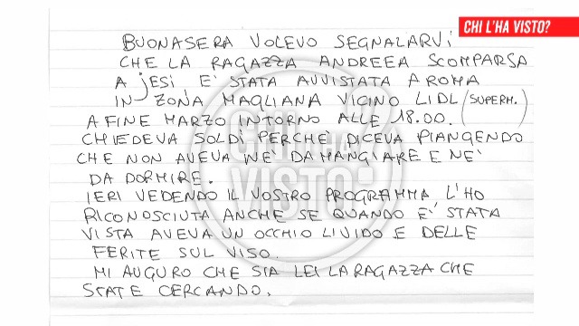 La segnalazione giunge dalla Magliana dove Andreea, stando a quanto scritto nel fax, sarebbe stata vista nei pressi del Lidl, mentre chiedeva in lacrime dei soldi per mangiare e aggiungendo che non aveva un posto dove dormire. La giovane, che dalla donna sarebbe stata riconosciuta come Andreea, «aveva un occhio livido e delle ferite al viso».