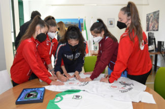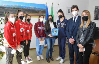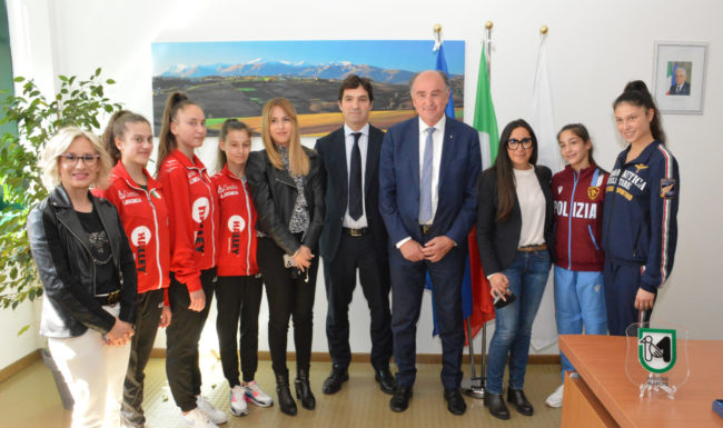 Le ‘farfalle’ Milena Baldassarri (capitano), Anais Carmen Bardaro, Lorjen D’Ambrogio, Sofia Raffaeli e Talisa Torretti sono reduci da un successo appena ottenuto: la conquista del sesto scudetto consecutivo, in questa disciplina dal grande fascino che richiede capacità tecniche notevoli. Erano accompagnate dalla vice presidente della società fabrianese, Maila Morosi, e dal dirigente Luca Piergentili. Presente anche Fabio Luna, presidente del Coni Marche.