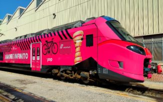 Il treno Pop sul quale viaggerà il Trofeo che sarà consegnato al vincitore del Giro d’Italia, 105esima edizione
