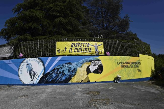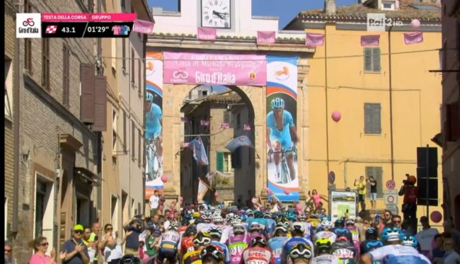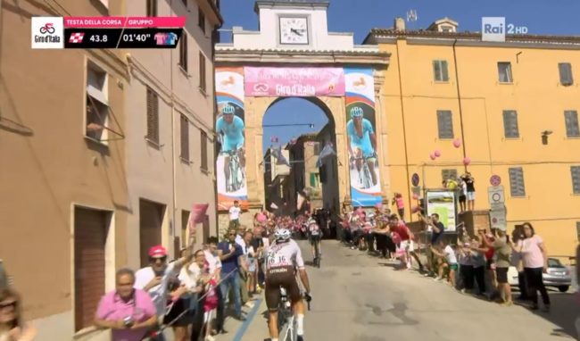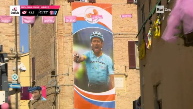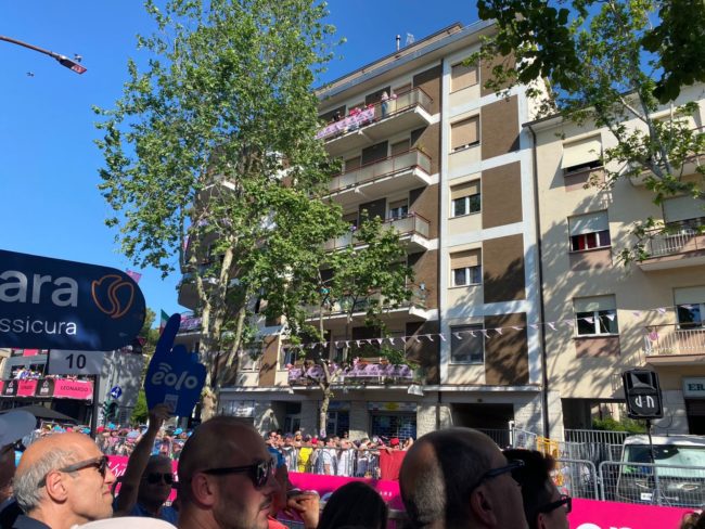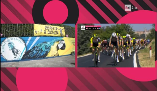 Prima dell’arrivo a Jesi, tra i tanti cittadini scesi in strada per non perdersi l’evento (oggi scuole di ogni ordine e grado chiuse), i ciclisti hanno toccato Filottrano, Santa Maria Nuova e Monsano. Quest’ultima località ha rappresentato un punto di svolta per la volata finale e, probabilmente, è stato anche lo scoglio più difficile, a causa della pendenza massima dell’11%, per gli atleti. Tra i momenti più toccanti, l’arrivo nella città del campione Scarponi. I cittadini e gli appassionati dello sport a due ruote hanno accolto i ciclisti in un tripudio di applausi e palloncini rosa. Ovunque si sono potute vedere immagini di Scarponi, “l’aquila di Filottrano”. Una dedica con cartelli e striscioni anche sull’erba del campo sportivo. Nel luogo dove perse la vita a causa di un’incidente mentre si allenava (fu travolto da un furgone il 22 aprile del 2017) è stato dipinto un murale per volontà della Fondazione che porta il nome del ciclista.