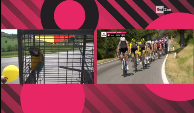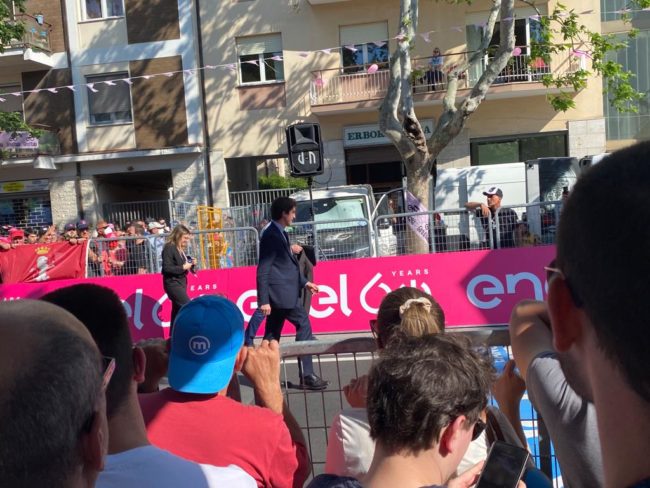 Tra i colori svettano il celeste e il giallo, quelli del pappagallino Franky che accompagnava Scarponi nei suoi allentamenti. Lo stesso pappagallino ha colorato le borracce della squadra dell’Astana, team di Scarponi. Oggi, l’animale è rimasto in gabbia per preservare la sicurezza dei ciclisti ed è poi stato liberato al passaggio del gruppo. Il pappagallo ha atteso la carovana proprio di fronte al murale dedicato a Scarponi. La tappa a Jesi mancava alla città di Federico II da 37 anni. Fin dalle prime ore della mattina, stand, animazioni e gadget del Giro hanno animato le strade cittadine. Tantissime le persone che hanno accolto l’evento: alcune hanno anche addobbato i balconi e finestre con stendardi del Giro e il colore rosa. Lanciata anche l’iniziativa Vetrine in Rosa. I migliori allestimenti, decretati dalla giuria composta dai rappresentanti dei commercianti di Jesi Centro e Jesi Vittoria, sono stati di Tango, Perla & co. e Galleria del Bambino. A Jesi, sua città natale, era anche presente la campionessa di scherma e la sottosegretaria allo Sport Valentina Vezzali. Presente il governatore Francesco Acquaroli per la premiazione del vincitore.