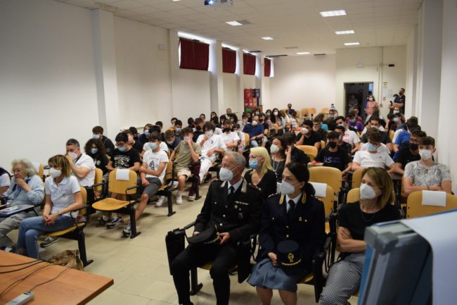 La platea di studenti e autorità che ha ascoltato Capitano Ultimo questa mattina all’iis Laeng Meucci di Osimo