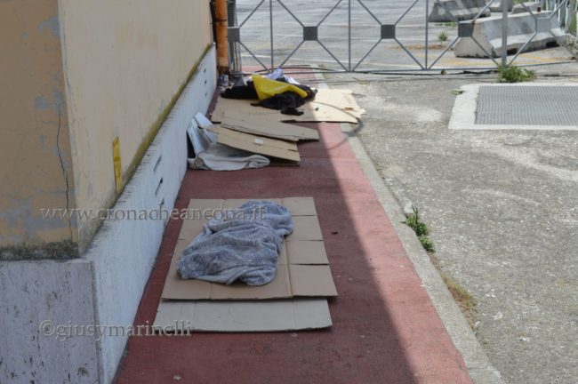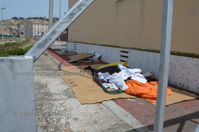 Nonostante il cartello e la chiusura dei bagni, la zona è comunque frequentata da chi una casa non ce l’ha ed è costretta a vivere nell’ex scalo oppure sul marciapiede davanti ai locali del wc, proprio a ridosso del marciapiede. Lo dimostrano le coperte, i vestiti, avanzi di cibo, cartoni e tutto quanto è necessario per un alloggio di fortuna. Una situazione simile, anche questa documentata più volte (leggi l’articolo), la si trova all’ex Mandracchio, sotto al porticato dell’ex Fiera della Pesca. Un altro ‘non luogo’, utilizzato per bivacchi e alloggi di fortuna. Il cartello di divieto di bivacchi è stato istituito partendo dall’ordinanza emessa nei giorni scorsi dall’Autorità Portuale e legata alle “disposizioni in materia di prevenzione di fenomeni di stazionamento, di occupazione, di bivacco, e di improprio utilizzo di spazi demaniali comuni nell’ambito portuale di Ancona. Tale ordinanza è stata disposta dopo l’esposizione di alcune situazioni di criticità e pericolo emerse in Prefettura nel corso del Comitato per l’Ordine e la Sicurezza Pubblica.