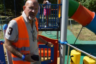 Arnaldo De Angelis mostra il gioco vandalizzato al parco ‘Il Gabbiano’ di Torrette