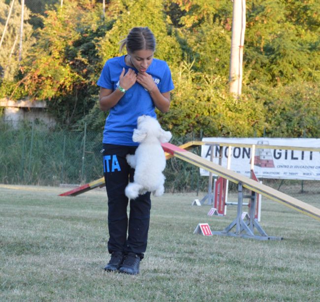 La squadra, guidata dall’immancabile conduzione al microfono di Valeria Ciattaglia che cura la parte più coreografica delle esibizioni, ha dimostrato – ricorda una nota di AnconAgility – le abilità di addestramento dei propri cani sia con una prova di educazione ed obbedienza che con giri di agility e accenni di dog dance. Si sono esibiti Elena Boari con il barboncino Effe Effe, Rebecca Boari con lo shetland Alì bau bau, Sarah Faustino (istruttrice) con lo shetland Summer, Silvia Pasquini con il meticcio Bibo, Giusy Marinelli con i due meticci Cody e Kelly, Giulia Romagnoli con i due meticci Artù e Flò, Alessandro Bolognini con il barboncino Vasco e Francesco Boari (Fondatore, Presidente e Istruttore) con il border collie Kurt Cobain.