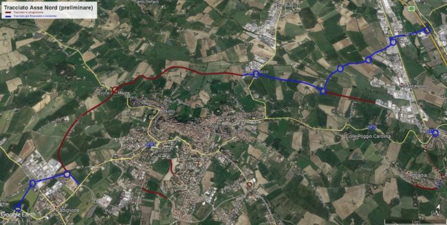 La variante a nord di Osimo (in rosso in tracciato da realizzare, in blu quello già finanziato ed esistente)