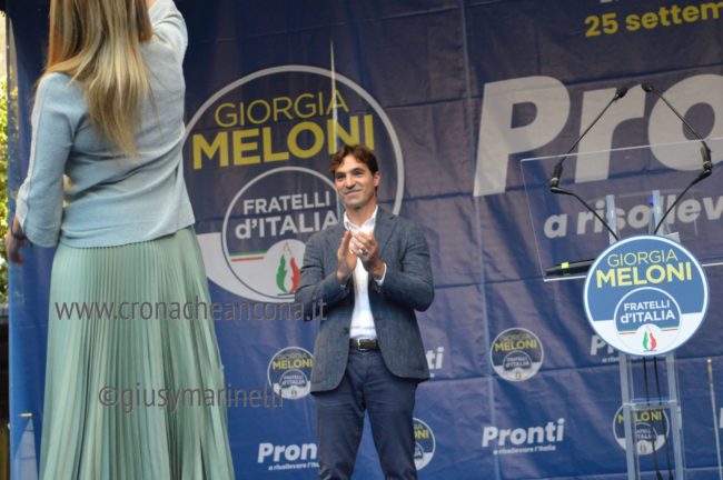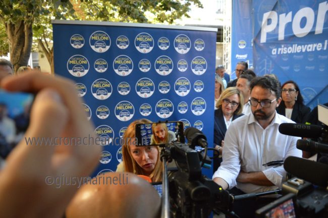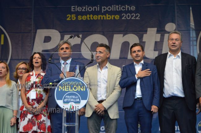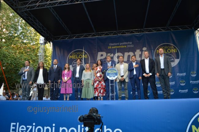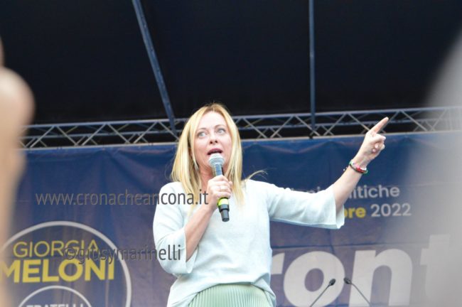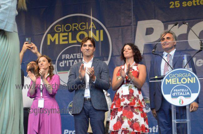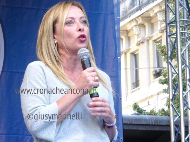 Giorgia c’è, la presidente di FdI è partita oggi dalle Marche con la campagna elettorale per il rinnovo del Parlamento. Giorgia e il suo popolo ci sono, peraltro in una piazza di Ancona dal nome propiziatorio, piazza Roma, stante l’avvio della corsa verso la Capitale. Con lei il capogruppo alla Camera Francesco Lollobrigida, ovviamente il governatore della Regione Marche, Francesco Acquaroli, di stretta e pluridecennale osservanza politica, poi ci sono la coordinatrice regionale di Fdi, Elena Leonardi, i candidati nei vari collegi, più o meno blindati, da Guido Castelli a Lucia Albano passando per Antonio Baldelli. In prima fila anche il capogruppo regionale di Fdi Carlo Ciccioli, poi vari primi cittadini e tra questi il sindaco di Ascoli Marco Fioravanti, di Falconara Stefania Signorini, di Sarnano Luca Piergentili, la vicesindaco di Macerata Francesca D’Alessandro.