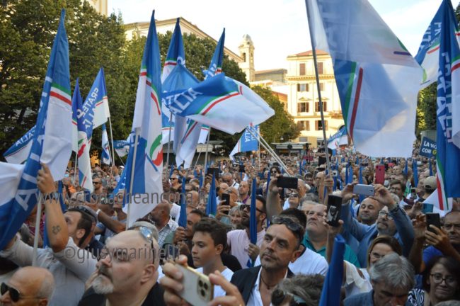 L’attacco al Governo Draghi. «L’Italia non è in una situazione facile, anche il Governo dei migliori ci ha lasciato in una situazione non facile, debito pubblico fuori controllo, guerra nel cuore dell’Europa, energia con prezzi alle stelle che mettono in ginocchio famiglie e aziende, ci vogliono le utenze di cittadinanza. Quelli che hanno costruito questa situazione vengono da voi e vi dicono che cambieranno le cose. Perché i prezzi delle materie prime salgono? La sinistra è stata per la globalizzazione senza regole, diceva che bastava commerciare all’estero e ci saremmo trovati con una crescita della ricchezza e che gli altri Paesi si sarebbero democratizzati: è successo il contrario, la ricchezza si è concentrata nelle mani dei pochi, le democrazie si sono indebolite a vantaggio delle dittature. E’ arrivata la pandemia e si è fermata la produzione di auto in Europa, ora l’Europa corre ai ripari». I patrioti. «La Meloni e Fdi sono autarchici ci dicevano – aggiunge – non possiamo fare riferimento a realtà che non possiamo controllare. Perché abbiamo il problema del gas? Perché l’Europa che in questi anni si è occupata di tutto, anche della cucina degli insetti, non ha ritenuto di studiare una strategia seria per l’approvvigionamento energetico. Dire che l’Europa non ha fatto bene il suo lavoro, non significa essere contro l’Europa, a me non interessa cucinare gli insetti, mi interessa accendere la luce. Ora il gas lo prendiamo dall’Algeria, bene, ma noi il gas lo vogliamo estrarre in Italia, sulle piattaforme qui davanti, prima c’erano gli ambientalisti e hanno detto no a tutto. Secondo me si dovrebbe ricontrattare parte del Pnrr con la Comunità europea, quando l’ho detto tutti contro FdI. ma lo stesso Gentiloni lo dice. Le priorità precedenti alla guerra in Ucraina sono diverse da quelle di oggi. L’obiettivo che si dà la Comunità europea è di abbattere le emissioni, buttandosi sull’elettrico. Bene, peccato che i prodotti arrivano dalla Cina che li produce partendo dal carbone». Ancora sull’inquinamento: «La tassa sulla plastica in Europa, i fiumi europei contribuiscono per lo 0,8% al versamento della plastica in mare, poi India e Cina portano l’80% in mare e noi importiamo i loro prodotti. Il principio del libero mercato va bene se le regole vanno bene per tutti, altrimenti ci vogliono i dazi di civiltà».