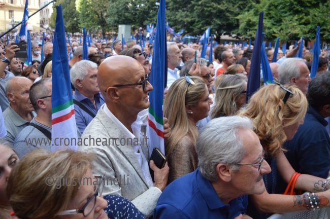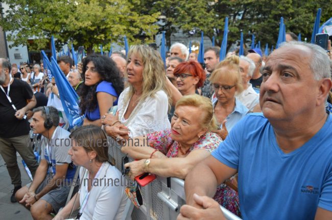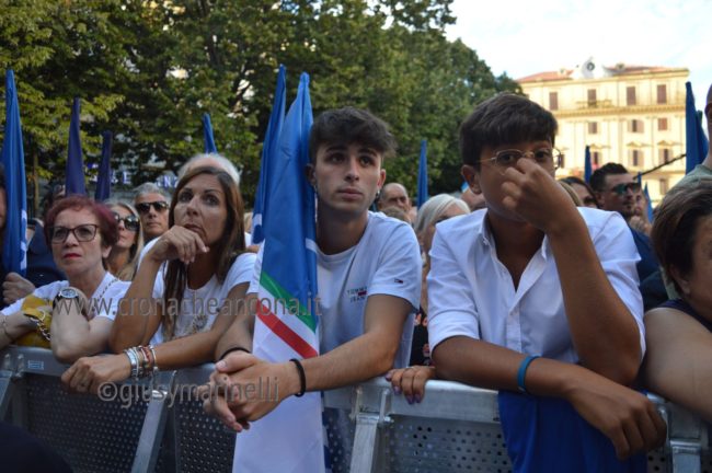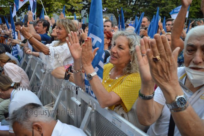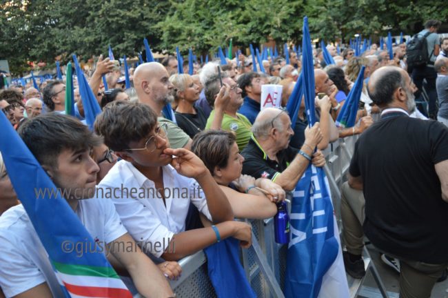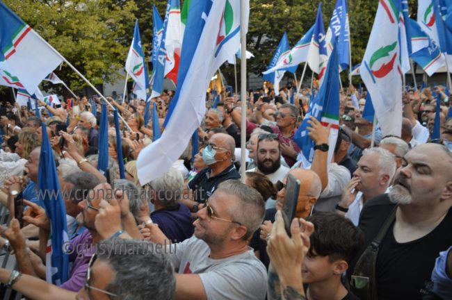 Il microfono passa a Giorgia Meloni, subito, senza ulteriori indugi e la presidente si lancia in una lunga requisitoria che tocca temi internazionali ed anche romani, con un affondo dedicato al ministro Lamorgese ribattezzata “Caronte” per via dei barconi. «Grazie – esordisce la Meloni – per questa piazza piena, il 23 agosto ad Ancona, non era facile. Mi lasciate ben sperare. L’entusiasmo e il sostegno del popolo sarà fondamentale in questa campagna elettorale, siete gli unici amici che abbiamo. Ho voluto iniziare da Ancona non a caso per ricordare che a differenza di quello che si dice molto spesso nei salotti della sinistra e di quello che scrive certa stampa che parla solo a se stessa, secondo i quali Fdi non ha classe dirigente capace di governare, nelle Marche abbiamo dimostrato di essere in grado di dare quelle risposte che la sinistra non è stata capace di dare per decenni. Ho deciso di candidarmi nel capoluogo regionale dell’Abruzzo il cui sindaco è stato confermato di recente, in una regione governata da noi. Chi dipende dai cittadini non tradisce, è a loro che va a chiedere il consenso, l’Italia ha bisogno di un Governo di persone libere, non ricattabili, che non si fanno comprare. In coscienza vi dico che penso di poter guidare un Governo così, non ci facciamo intimorire, ricattare. Cose normali di buon senso che potrebbero cambiare tanto, siamo in una situazione complessa, difficile, non promettiamo cose che non possiamo realizzare».