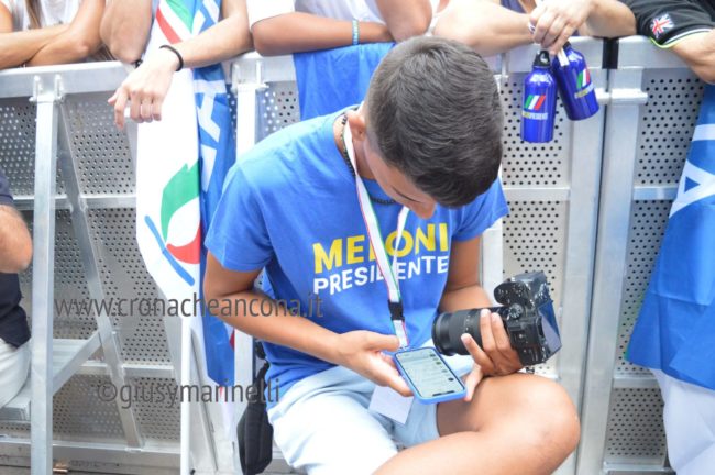 L’appuntamento è per le 18, in piazza Roma il colpo d’occhio dice che ci sono più o meno duemila persone. Reduce dal meeting di Rimini, la leader di Fdi arriva con un leggero ritardo per poi concedersi ai microfoni dei media. Sul palco si parte alle 18.30 tra lo sventolio delle bandiere di Fratelli d’Italia e il controllo serrato delle forze dell’ordine. Una breve introduzione del governatore Francesco Acquaroli: «Due anni fa i marchigiani hanno scelto di cambiare e di scrivere una storia nuova, stiamo mantenendo fede agli impegni con risultati sotto gli occhi di tutti. Oggi c’è l’opportunità storica, una donna alla guida della nazione».