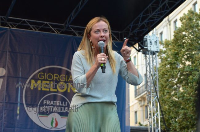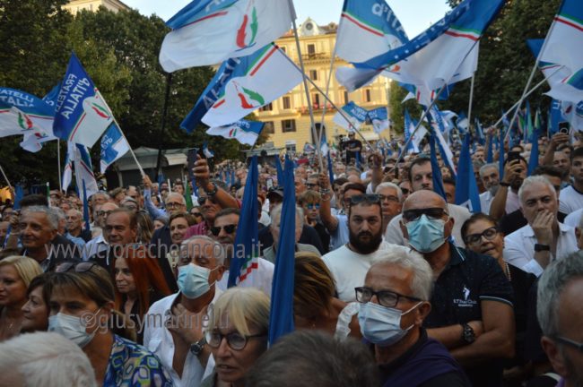 La vicenda del video sullo stupro. «A Piacenza una donna viene stuprata, alcuni quotidiani pubblicano il video senza far riconoscere la donna – dice Meloni – Riprendo il video, apriti cielo. Ho pubblicato il video in cui non si vedeva nulla, ho solo pensato di aiutare a rilanciare il dibattito sul problema. Sta per partire l’indagine, come se fossi stata io la fonte della notizia. Perché qualcuno non ci spiega come è uscito il video? Quando morì il povero Alika a Civitanova il video fu ripreso senza oscurare il volto di chi moriva. Vi racconto questa storia perché in questa nazione non tutti hanno lo stesso trattamento, a sinistra si va nei salotti, se la stessa cosa la fa la destra si va in galera. Abbiamo gli stessi diritti, la sinistra ha solo l’egemonia di potere, non culturale, vuol fare paura ma io non ho paura, sono disposta a condurre questa battaglia. La domanda è voi siete pronti?» e dalla piazza parte il coro, ovviamente sì. Giorgia c’è, ed attacca i media: «Ci sono quotidiani che mettono dieci giornalisti a cercare di scavare storie che non trovano nel nostro passato, hanno paura di chi non possono ricattare, hanno paura degli italiani liberi, non faccio la politica per odio, non ho bisogno di odiare nessuno, la mia personale battaglia è liberare la nazione dal sistema di potere che l’ha tenuta sotto schiaffo, il 25 settembre dipenderà dagli italiani». Saluti sulle note dell’Inno d’Italia.