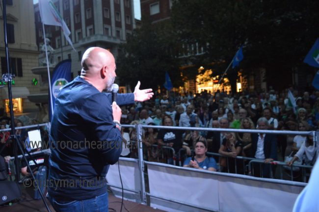 Mentre Enrico Letta parlava ai suoi elettori al ridotto delle Muse (leggi l’articolo), negli stessi momenti Gianluigi Paragone spiegava al proprio elettorato il programma elettorale di Italexit. Supportato dal filosofo Diego Fusaro, l’ex giornalista ha parlato ad oltre 200 persone corse a piazza Roma per ascoltarlo.