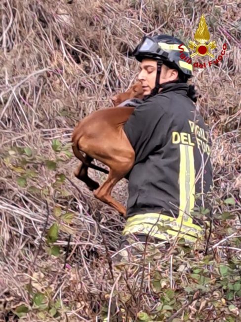 Chiamato il 115, i pompieri sono giunti sul posto e, studiata l’area, si sono messi subito al lavoro facendosi strada tra i fitti rovi con la motosega, riuscendo poi a raggiungere e liberare il cane che è stato consegnato al proprietario, in buone condizioni di salute.