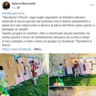 Se da un lato c’è il post del sindaco Valeria Mancinelli che elogia su Facebook ‘La mejo gioventù’ per «la lodevole iniziativa di alcuni giovani del quartiere che si stanno adoperando a spese loro per ridare lustro e decoro al parco del Pincio preso spesso a bersaglio di vandali», dall’altro c’è chi, nel vedere il risultato della «lodevole iniziativa», ha sgranato per un attimo gli occhi sentendo un brivido corrergli lungo la schiena.