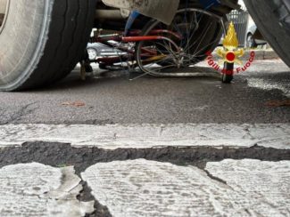 La donna, all’arrivo dei soccorsi, si trovava in gran parte sotto al mezzo pesante con tutta la bicicletta.