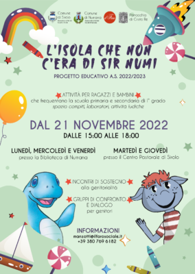 L’isola che non c’era di Sir Numi” è il progetto educativo rivolto ai bambini e ai ragazzi della scuola primaria e secondaria di primo grado e ai genitori, residenti nei Comuni di Numana e Sirolo. E’ promosso e nasce dalla sinergia tra le due amministrazioni comunali, la cooperativa ‘Il Faro’ di Macerata e le parrocchie dei due Comuni. «Il servizio rappresenta la risposta ad una complessità di bisogni espressi dai giovani e dalle loro famiglie, per offrire loro uno spazio di ascolto, di incontro, di socializzazione e condivisione di esperienze. E’ proprio sulla prevenzione, infatti, che le amministrazioni comunali di Numana e Sirolo intendono intervenire, cogliendo le difficoltà emotive, psicologiche e sociali che interessano un numero significativo di giovani, aggravate dalla pandemia.