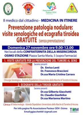 La Prevenzione del nodulo al seno-tumore della mammella e del nodulo tiroideo sono le due tematiche che verranno affrontate domani mattina nei locali della Confraternita della Misericordia di Osimo Stazione, dalle 9 alle 12.