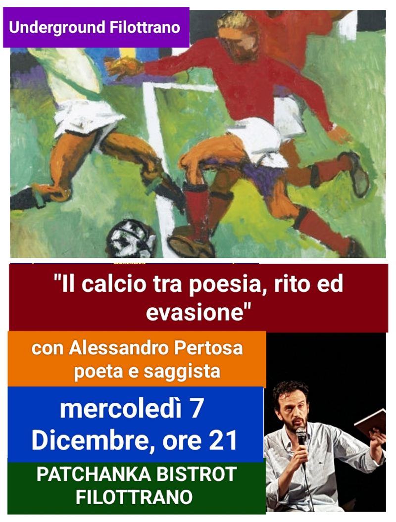 Il calcio, nonostante “l’invasione di campo” del dio denaro, rimane un rito ancestrale e tribale per migliaia di tifosi di qualsiasi squadra. Perché unisce nel rito della lacrima e della gioia chiunque, il ricco e il povero, l’ignorante e l’intellettuale, l’onesto e il birbante. Underground Filottrano gli rende omaggio con una serata dal titolo ‘Il calcio tra poesia, rito ed evasione’ in compagnia di Alessandro Pertosa, poeta e saggista, e di altri amici di questo meraviglioso sport. L’appuntamento è per mercoledì 7 dicembre al Patchanka Bistrot di Filottrano, alle ore 21. Chi vuole può anche prenotare l’apericena a partire dalle ore 19 chiamando direttamente il locale.