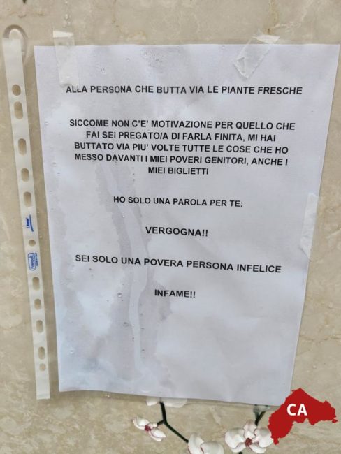 C’è chi ha messo anche dei cartelli nei quali è stato scritto di “Non toccare gli oggetti altrui” mentre un altro è rivolto proprio “Alla persona che butta via le piante fresche” e che poi continua dicendo che «Non c’è motivazione per quello che fai. Sei pregato/a di farla finita, mi hai buttato via più volte le cose che ho messo davanti ai miei poveri genitori, anche i miei biglietti. Ho solo una parola per te: vergogna!».