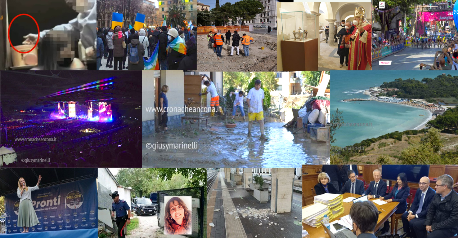 Gimbo Tamberi e Chiara Bontempi sposi: il 1 settembre campione olimpico convola a nozze a Pesaro con una cerimonia privata ma molto partecipata da vip. Il 6 settembre muore a Falconara, Daniela Volponi, detta Toffee, 57 anni per un investimento stradale. Il ministro Luciana Lamorgese accende, l’8 settembre, la Lampada della Pace a Loreto. E’ la notte tra il 15 e il 16 settembre quando i fiumi Misa e Nevola rompono gli argini. Pioggia e fango si riversano sulle strade e nei centri cittadini creando uno scenario apocalittico nelle zone del Fabrianese e del Senigalliese.E’ la notte dell’alluvione. Subito al lavoro forze dell’ordine, Protezione Civile e i vigili del fuoco intervenuti con mezzi anfibi, insieme colleghi in arrivo dalle regioni limitrofe. La piena non risparmia nessuno. In quella tragedia trovano la morte il piccolo Mattia Luconi di appena 8 anni; la 17enne Noemi Bartolucci; Giuseppe e Andrea Tisba, padre e figlio di 65 e 25 anni; Diego Chiappetti di 52, Fernando Olivi di 84 anni, Mohamed Ennaji di 42; Augusto Montesi, di 82 anni; Maria Luisa Sereni di 72; Michele Bomprezzi di 47; Gino Petrolati di 89 anni ed Erina Febi di 77 anni. Tuttora in corso le ricerche di Brunella Chiu, la 56enne mamma del 23enne Simone Bartolucci, fratello di Noemi, unico della famiglia ad essersi riuscito a mettere in salvo aggrappandosi ad un albero dal quale chiama i soccorsi. Il 26 settembre, a spoglio delle elezioni politiche completato, il centrodestra si afferma anche nelle Marche come prima forza politica della città. Ancona elegge il deputato Stefano Benvenuti Gostoli (FdI). Il Partito Democratico nel capoluogo di regione si conferma il primo partito cittadino, ma Fratelli D’Italia è secondo con un distacco di soli 84 voti