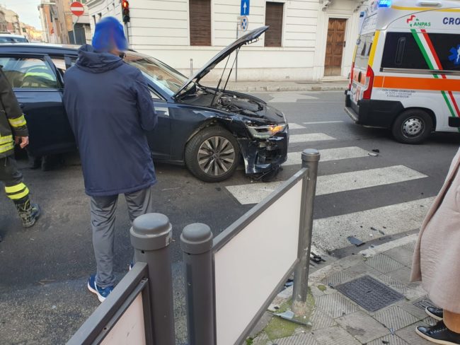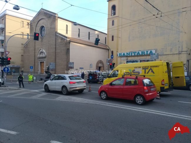 Coinvolte due auto: un’Audi e una 500, quest’ultima poi finita contro i pali che delimitano il marciapiede davanti alla chiesa della Misericordia.