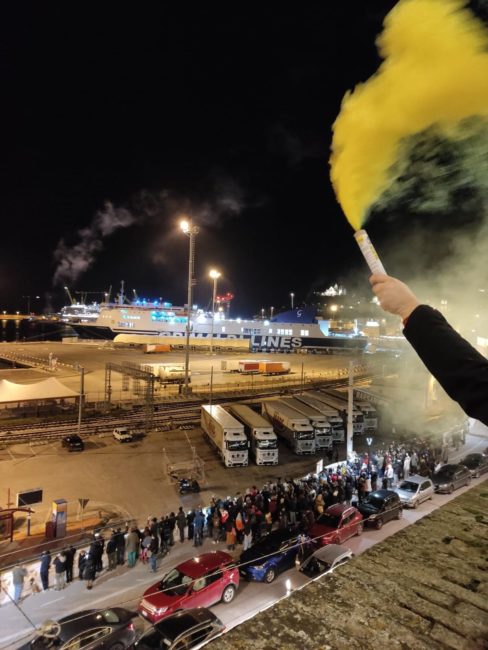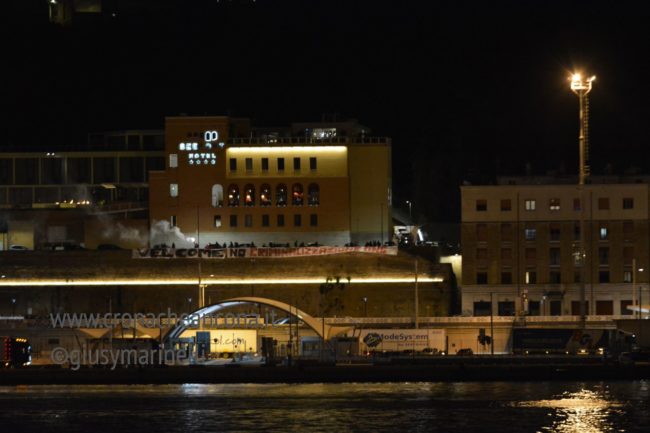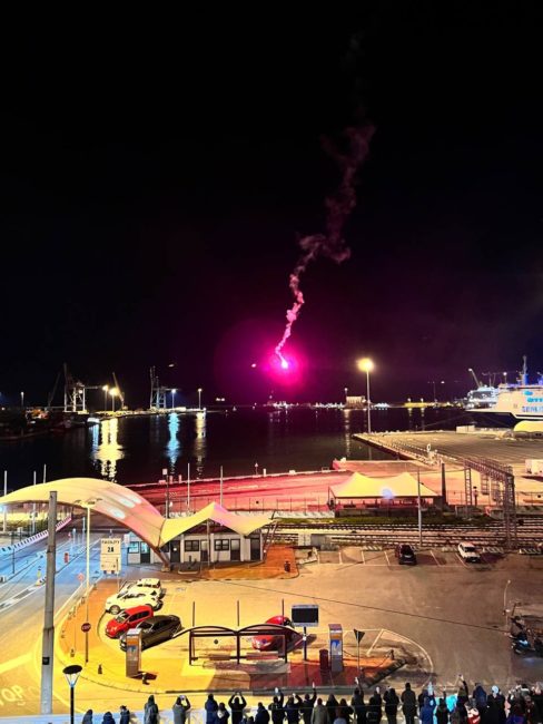 Fumogeni sono stati accesi non appena l’imbarcazione ha fatto ingresso nello scalo dorico, a voler dare il ‘benvenuto’.