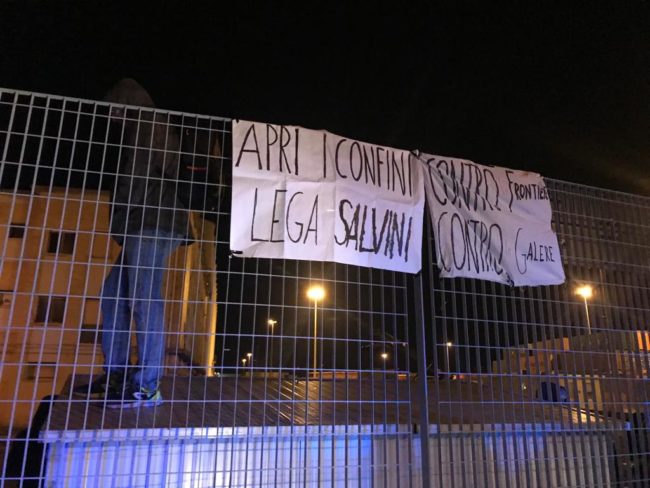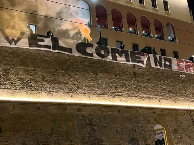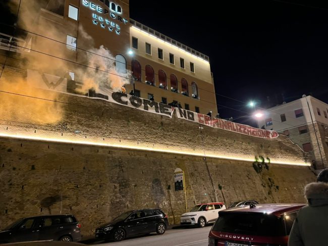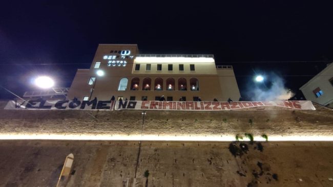 Un corteo pacifico, fatto di cartelli e uno striscione srotolato poi sul muraglione di via XXIX Settembre riportante la frase: “Welcome. No criminalizzazione Ong”.