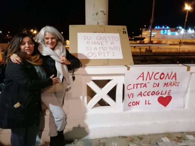 Successivamente, un gruppo appartenente ai Centri Sociali delle Marche è arrivato fino al porto per «Avvicinarci il più possibile a queste persone – ha detto Nicola Mancini, senigalliese del Centro Sociale delle Marche, condividendo l’idea degli altri presenti – perché ci immaginiamo siano devastate da un viaggio assurdo e, arrivare in un Paese, in una città dove almeno c’è qualcuno che ti dice ‘benvenuto’ è un gesto di umanità, piccolo, ma è anche quello che noi possiamo fare».