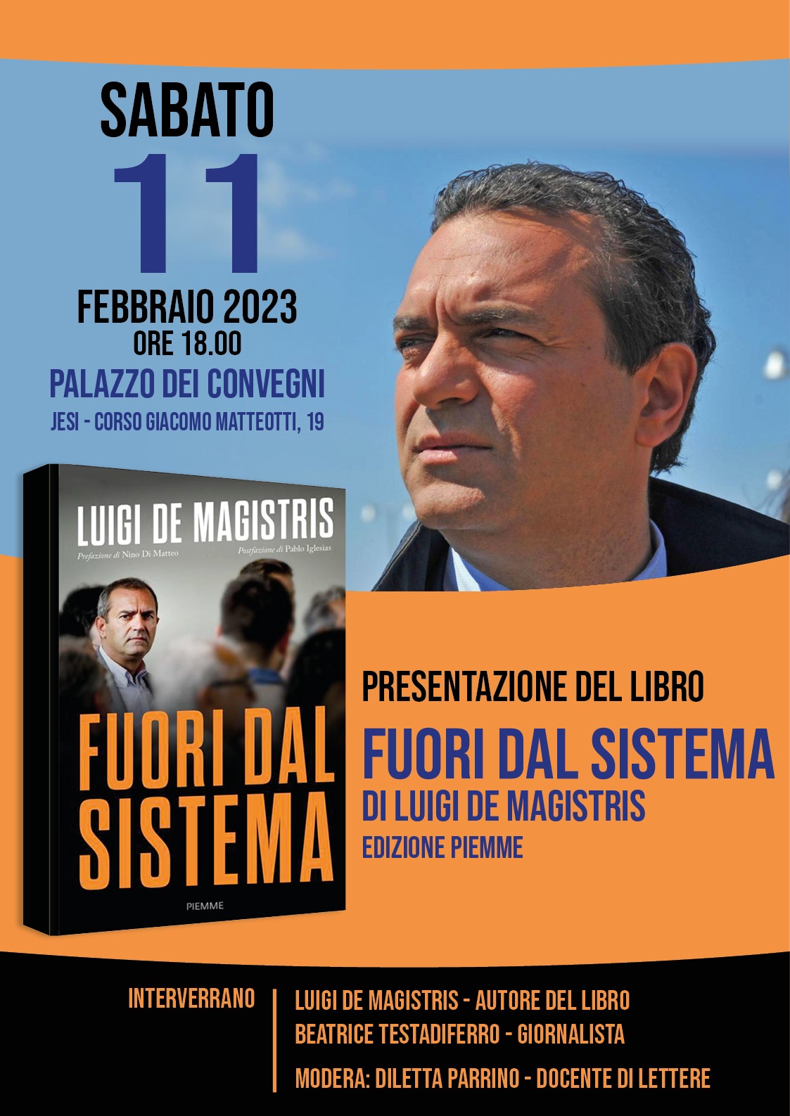 Il tema richiama inevitabilmente il titolo dell’ultimo libro di de Magistris, “Fuori dal sistema”, che sarà da lui stesso presentato alle 18 a Jesi, Palazzo dei Convegni in Corso Matteotti. Il libro è il racconto di una vita dedicata al bene comune, senza mai cedere a compromessi. Ma è anche uno sguardo rivolto al futuro del Paese, oppresso non solo dal sistema criminale che de Magistris ha combattuto da pubblico ministero, ma anche da un pensiero unico liberista a cui urge proporre un’alternativa. Unione Popolare si sta organizzando proprio per questo.