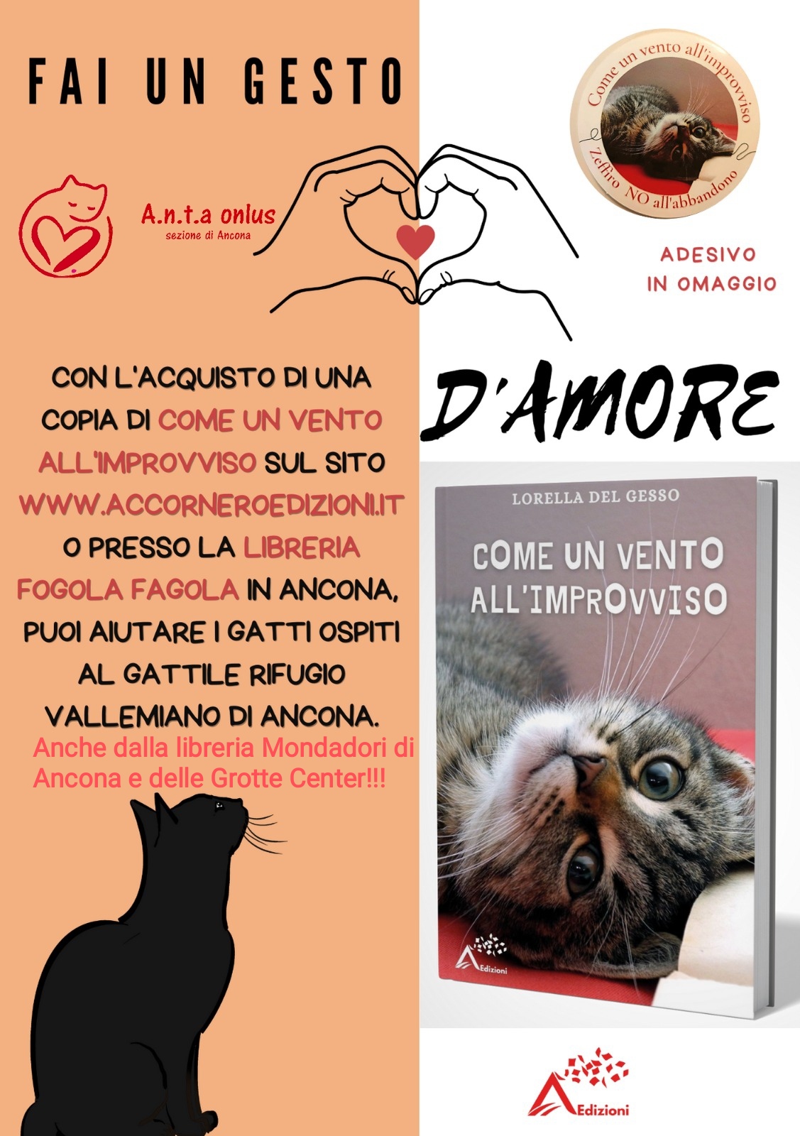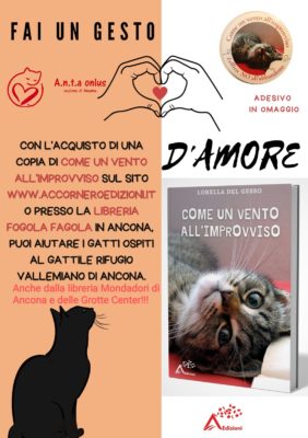La casa editrice Accornero è anconetana, ha sede a Polverigi ed è giovane perché è nata ad agosto 2022 , indipendente e non a pagamento. Con il libro “Come un vento all’improvviso” di Lorella Del Gesso, il quale nasce da una storia vera, e racconta di un gattino di pochi mesi, Zeffiro, abbandonato a Ferragosto, si trova improvvisamente da solo e senza più punti di riferimento, parecchio destabilizzato, addirittura traumatizzato… Solo dopo aver fatto la conoscenza di tanti altri amici-mici, Zeffiro si sentirà come rinato. Con l’acquisto di “Come un vento all’improvviso” si partecipa alla campagna ‘No all’abbandono’ indetta dalla casa editrice Accornero Edizioni in favore del gattile di Vallemiano di Ancona.