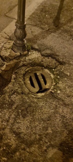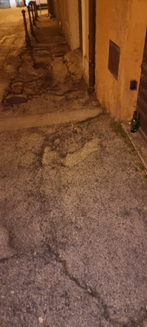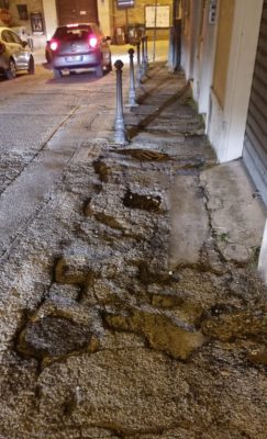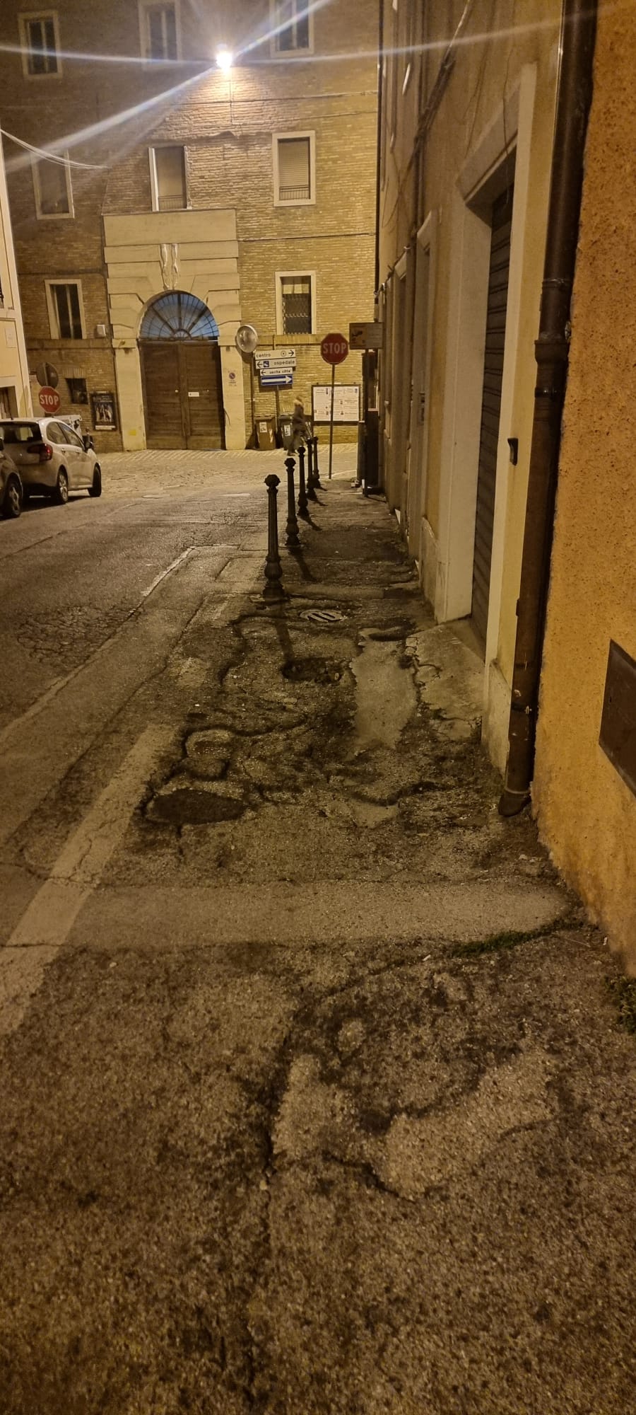 L’insidioso passaggio pedonale di via Pompeiana punteggiato di buche, in fondo si intravede il portone secondario dell’ospedale Ss. Benvenuto e Rocco di via Matteotti